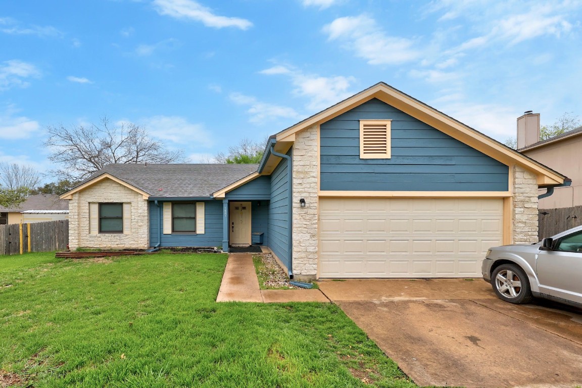 Single story home in the popular community of The Meadows of Chandler Creek which is located on the East side of Round Rock nestled in the hill country ~ Inviting covered front porch ~ Updates include easy maintenance vinyl flooring throughout, recent painting, ceiling fans and lighting plus remodeled owner’s suite bath ~ Open family room with a cozy stone surround fireplace with raised hearth as the focal point ~ Cheerful kitchen with breakfast bar, stainless steel appliances, freestanding gas range and pantry ~ Open floor plan ~ Dining room just off the kitchen offers a sliding glass door that leads to the back patio ~ Spacious owner’s suite with full bath including dual vanity, walk-in closet, tub/shower with subway tile backsplash ~ Fully fenced backyard with a huge oak tree and open deck is a great space to entertain friends and family with summer barbecues ~ Fantastic community amenities including an oasis of lit trails (nearly half a mile), playgrounds, picnic areas, ball fields, and pool ~