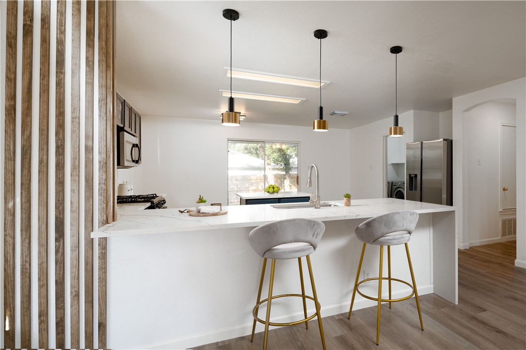 This lovely one-story house in popular Carriage Hills neighborhood is fully and newly remodeled. It’s beautifully done with updated flooring, contemporary bathroom faucets/vanities/shower-heads, modern light fixtures, and remodeled kitchen. The new tenant can enjoy the brand new gas range, refrigerator, kitchen sink, washer/dryer, and dishwasher. The kitchen features a large center island with new quartz countertops and opens up to the dining/breakfast area. Tons of natural light, and a beautiful, big backyard with updated landscaping, and covered porch perfect for sipping your morning coffee or entertaining friends! Ideally located close to schools, medical facilities, restaurants, multiple parks including popular Veterans Memorial Park, and main Highways/Toll Roads (183 and Lakeline Blvd.) Don’t forget about the award winning Leander schools. You will love living in this friendly, sweet neighborhood and will never get tired of coming home to this beautiful, relaxing haven. The owner put lots of love into this house, and they are hoping to find tenants who love it as much as they do.