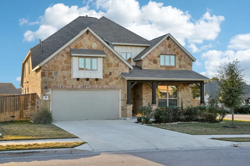 Welcome home to this spacious beauty in 6 Creeks! This stunning residence boasts a large floorplan on a spacious corner lot. The home offers tons of curb appeal with established landscaping, rock facade, and an inviting front porch with impressive wooden columns. Once inside, you will discover an expansive open living area with abundant light, soaring ceilings, and dream kitchen with many upgrades. Huge walk-in pantry, new double ovens, and a Viking gas cooktop with 5 burners are a few of the kitchen's charms. There are two bedrooms downstairs, one of which is the main bedroom suite with bay windows. The laundry room opens to the main bedroom closet for convenience. Hardwood stairs lead you up to an oversize flex space and luxurious media room. The second floor also provides 2 additional bedrooms, a full bath, and over 900 SF of storage in large attic spaces. Outside you will enjoy the back patio with freshly landscaped yard for relaxation and plenty of room for gatherings. The home is situated in a desirable location within the 6 Creeks neighborhood - you will enjoy quick access in and out as well as to the rec area one street over. The neighborhood amenities include a refreshing pool for summer days, a playground pavilion, opportunities for community socializing, and hike/bike trails. Creative financing options available: quick-close bridge loans, and 30 year loans as low as 5.85% all for qualified applicants. Easy access to Austin via Old Stagecoach or 150. Schedule a showing today! Agent is related to owner. This was built by Coventry Homes!
