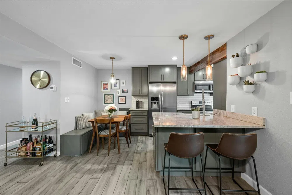 Experience modern living with this upgraded 2-bedroom, 1-bath condo at the Loft Condominiums! This home stands out with its sleek remodel, including a kitchen outfitted with granite countertops, stainless steel appliances, soft-close cabinets, and a spacious island featuring a hidden trash and additional storage. There's even a SUPER RARE space for a washer and dryer, making laundry day a breeze. You'll love the open-concept living and dining area, where the fresh, contemporary design is perfect for both entertaining and relaxation. The new sliding patio door, equipped with built-in blinds, leads to a large patio with a pool view. The condo offers ample storage options, including a coat closet and a finished outdoor storage closet with electricity, ensuring you have all the space you need. The primary suite is a standout feature, offering a walk-in closet with custom built-ins. The full bathroom, with a deep soaker tub, is perfect for relaxing after a long day. Located on the quiet corner of Peacock Street, this unit provides the ultimate in tranquility and convenience. With a designated, covered parking spot right in front and a parking lot level entrance, you’ll enjoy easy access to the unit with no stairs to navigate. The Loft Condominiums are situated in an unbeatable location, just minutes from downtown. Nestled between Congress and Lamar, you’re in the heart of the action, with cool shops and popular restaurants like Summer Moon, Torchy’s, and Toss right around the corner. The community itself is a gem, featuring a dog park, a shaded pool with a fountain, and beautifully landscaped grounds. Plus, with low HOA dues covering water, sewer, trash, and exterior insurance, this condo offers a perfect blend of style, location, and value. Don’t miss your chance to own this exceptional property—schedule a visit today and see what makes it so special!