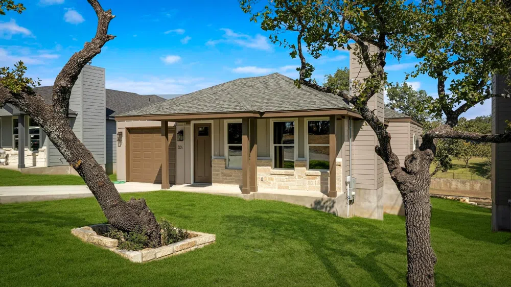 Come enjoy a stunning new construction single story water view home in a beautiful cove of Lake LBJ. A beautiful 3/2 with one-car garage home designed for fun-friendly lake life. It provides a beautiful water view without the additional taxes of water frontage. The open floor plan maximizes space and natural light, creating an inviting atmosphere for gatherings and relaxation. The modern kitchen features stainless steel appliances and ample space to serve friends and loved ones during the holidays, while the covered deck and yard offer the perfect space for outdoor entertaining, complete with scenic lake views. Evenings might be spent in the off season next to the fireplace. This energy efficient home has foam insulation in the attic making it a cool space. The exterior of the home is woodless for increase wood-eating pest protection except the wood deck which features saltwater rated piers for durability and lifespan. Ideal for a retreat, this property also presents a lucrative short-term rental opportunity. The peaceful cove has been recently cleaned and looking amazing.