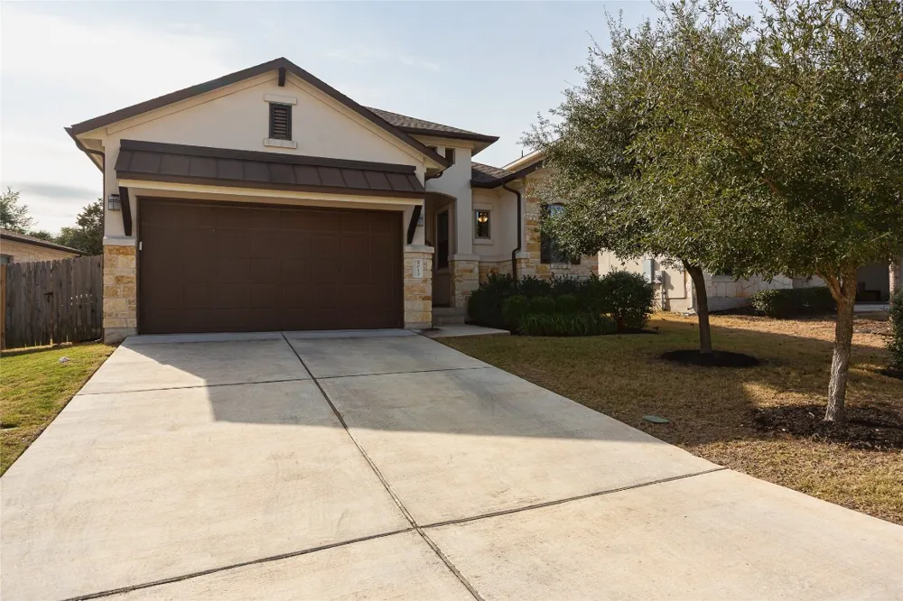 Nestled in Greyrock Ridge, one of the newer sections of Circle C Ranch, this stunning single-story home backs to tranquil green space, offering rare privacy and peaceful, tree-filled views with no neighbors behind. Flooded with warm natural light, the home showcases a spacious, open-concept floor plan designed for both everyday comfort and effortless entertaining. Soaring ceilings and wood-like tile flooring set the tone throughout the main living areas, while the designer kitchen is the heart of the home. Featuring a large center island, dark-gray cabinetry, Silestone countertops, built-in oven, five-burner cooktop, and sleek black matte fixtures and hardware, this space blends modern sophistication with timeless style. The inviting family room is highlighted by coffered ceilings and dual sliding glass doors that open to a covered back patio overlooking lush greenery, perfect for morning coffee, evening gatherings, or simply unwinding in nature. The expansive primary suite offers a serene retreat with bay window and spa-inspired bath complete with a soaking tub, separate shower, three vanities, and a massive walk-in closet. Two additional secondary bedrooms provide comfort and flexibility, while the oversized laundry room doubles as a bonus flex space ideal for a home office or work out area. Outside, the home boasts beautiful curb appeal with lush native landscaping. Circle C Ranch is one of South Austin’s premier communities where residents enjoy access to highly acclaimed schools, four community pools (including one with a slide), playgrounds, a clubhouse, soccer and activity center, disc golf course, and miles of scenic hiking trails. Greyrock also features its own dedicated pool and playground, direct access to the Violet Crown Trail and is just minutes from the Grey Rock Golf Course and Tennis Club. Conveniently to H-E-B, restaurants, shopping and the Alamo Drafthouse with its iconic rotating mural, this home perfectly blends lifestyle, and location.