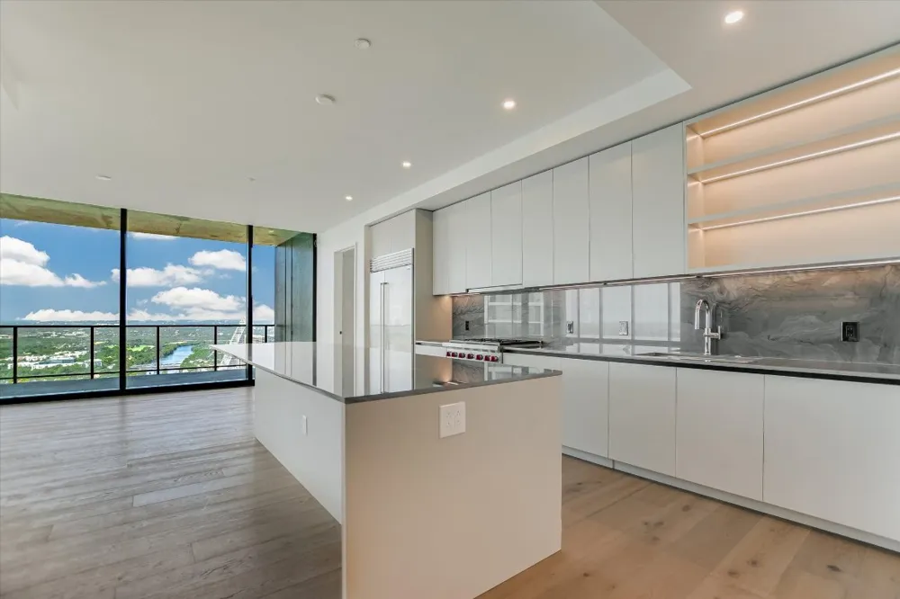 Luxury redefined in this expansive residence situated on the southwest corner of The Modern. Featuring over 3,800 sq ft, this thoughtfully designed 5 bed, 5.5 bath residence with soaring views of Lady Bird Lake and the Austin skyline offers the very best of urban living. Floor-to-ceiling glass frames stunning sunset, city and hill country vistas, along with two sprawling covered balconies. The chef-inspired kitchen features dark quartzite natural stone countertops and full height backsplash, Italkraft cabinetry, high-end appliances including SubZero refrigerator, Wolf six-burner range and microwave, and Bosch dishwasher. Entertain with ease with the beautifully designed wet bar equipped with SubZero 86-bottle wine fridge with LED lighting and separate temperature controls, refrigerator drawer and freezer drawer with ice maker, and lighted shelving. The elegant primary bath is a welcome oasis showcasing a curated selection of designer tiles, walk-in shower and soaking tub, dual vanity with backlit mirrors and expansive walk-in closet. Three of the secondary bedrooms feature en-suite baths for added privacy. Additional highlights include AV upgrades, hardwood + tile flooring and two premium reserved parking spaces. Residents will enjoy over 19,000 sq ft of curated amenities across three levels, including a 25-meter pool and spa, indoor and outdoor lounges with private dining areas, catering kitchen and gas grills, fitness center and yoga studio, dog park and wash station, board rooms and business center, sky lounge, guest suites, and 24/7 concierge service. Perfectly positioned in the Rainey Street District, The Modern offers unmatched access to Austin’s best restaurants, nightlife, and the scenic trail along Lady Bird Lake.