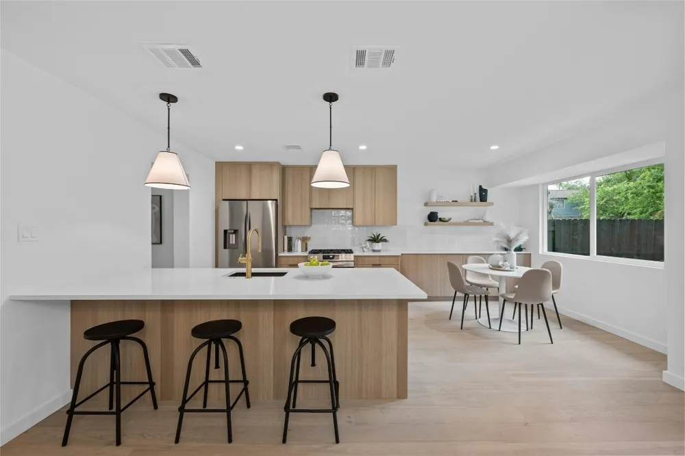Welcome to this stunning, fully remodeled home nestled in the heart of 78745. This coveted two-story floor plan offers a perfect blend of functionality and style, with the kitchen, dining room, living room, and powder bath conveniently located on the main level, and three bedrooms and two full baths on the second level. White oak hardwood floors offered throughout the entire home. The modern kitchen is a chef's dream, featuring custom white oak cabinets, quartz countertops, and stainless steel appliances. The large handcrafted island opens seamlessly to the living room, creating an ideal space for entertaining. Step outside to discover a huge backyard, complete with a covered, tiled patio and a designated area for a firepit, perfect for outdoor gatherings and relaxation. Enjoy the added benefit of all-new windows throughout the home, enhancing both aesthetics and energy efficiency. Don't miss the opportunity to own this exquisite home that perfectly combines modern comforts with classic style.