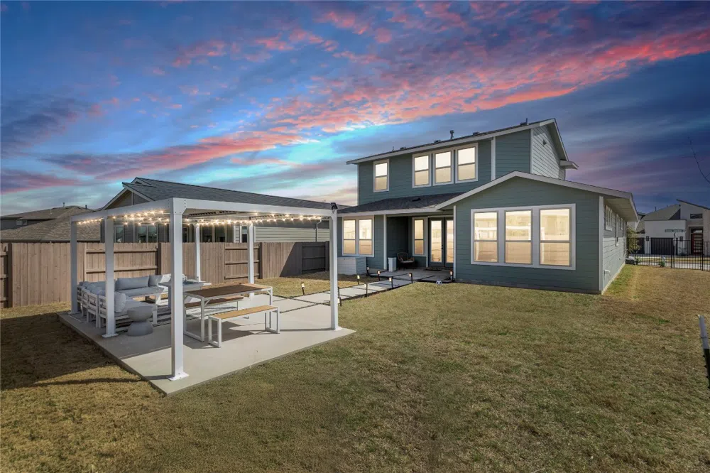 This like-new home is located on a spacious corner lot within a very short walking distance to all of Easton Park's amenities including the 25+ acre Skyline Park and The Union amenity center. Offering both beauty and functionality, this property features two covered patios—ideal for outdoor entertaining or relaxing in the shade. Walk from the back door of the home out onto a custom flatwork walkway leading to the beautifully designed covered patio sitting area perfect for your firepit and dining table. Step inside to a bright and airy open floor plan with soaring ceilings, an abundance of natural light, and beautiful hardwood floors flowing throughout the main great room. The well-designed layout includes a luxurious primary suite on the main level, along with a guest bedroom and an additional full bath for added convenience. The gourmet kitchen features a separate cooktop and wall oven, plus white cabinets with matte black hardware and an accent color on the island that elevates the look. Open, horizontal railing looking down from upstairs makes for an open and modern look as you head up to the spacious gameroom—perfect for movie nights or playtime—along with two additional bedrooms and another full bathroom. Another bonus is the Tesla car charger in the garage. With its inviting design, fantastic outdoor space, and prime location, this home is a must-see!